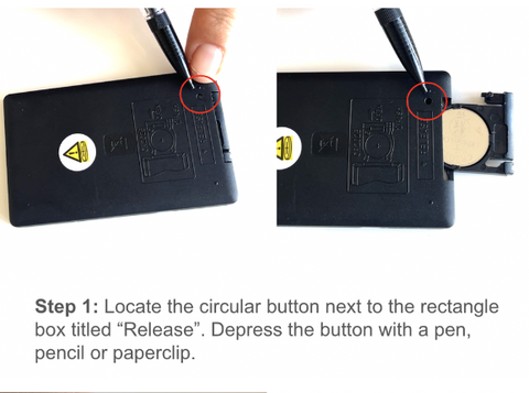 Locate the circular button on the back of your remote next to the rectangle box titled “release.” Depress the button with a pen, pencil, or paperclip.