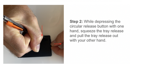 While depressing the circular release button with one hand, squeeze the tray release and pull the tray release out with your other hand.